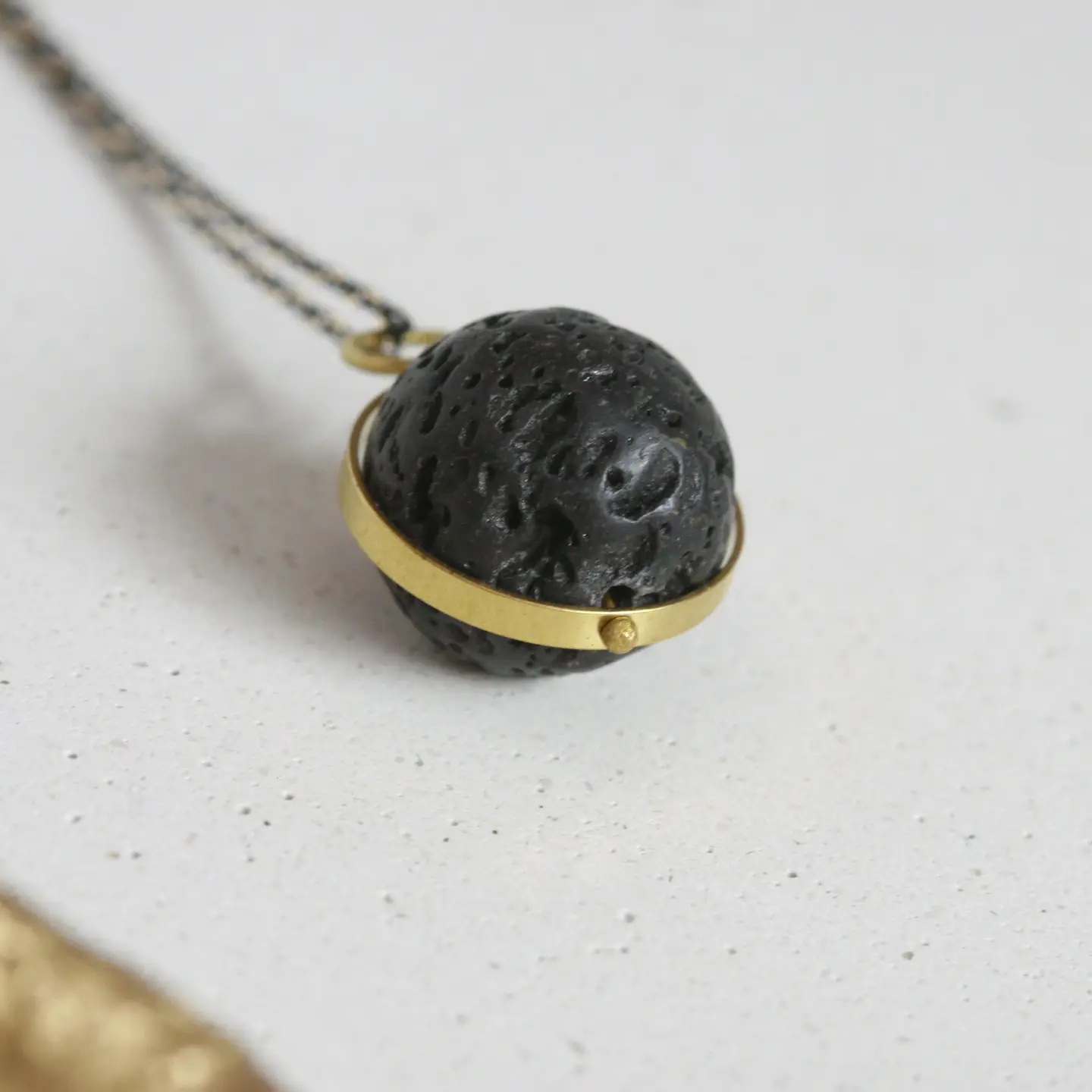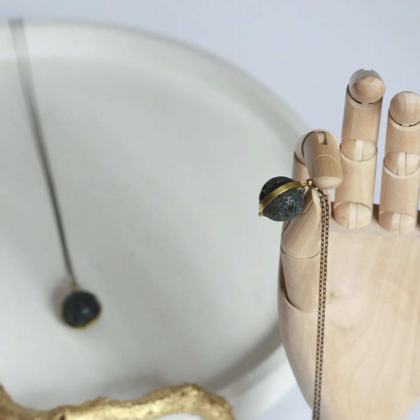 cuentas de lava natural y un colgante circular de latón.