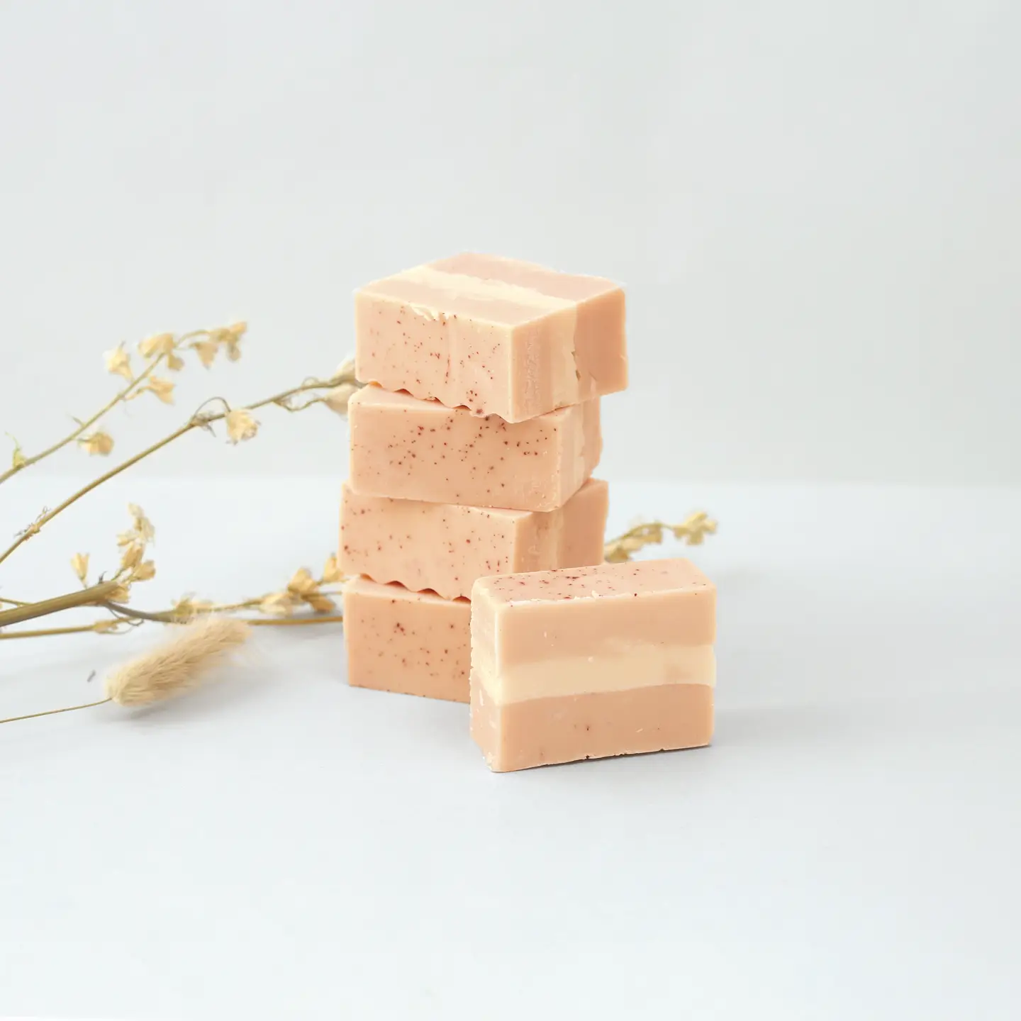 jabones bicolores con arcilla rosa y el sutil aroma de arena blanca.